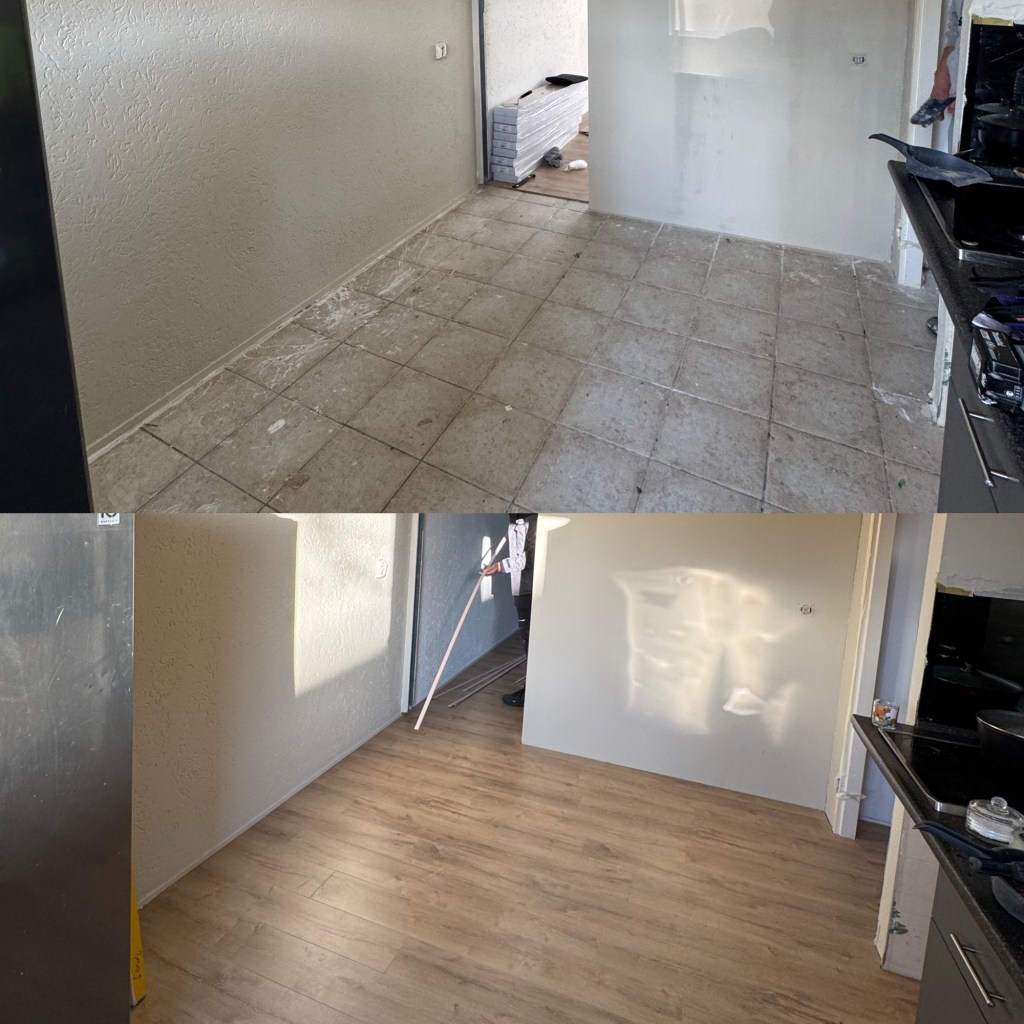 In dit project hebben wij de oude tegelvloer verwijderd en een nieuwe laminaatvloer geplaatst. De ruimte is volledig vernieuwd en afgewerkt voor een nette en moderne uitstraling.
