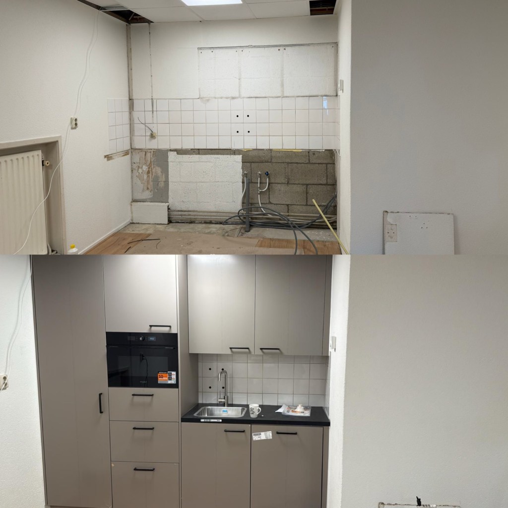 De oude keukenopstelling is verwijderd en de ruimte is voorbereid voor een nieuwe keuken. Daarna hebben wij een nieuwe keuken geplaatst en gemonteerd met kasten, apparatuur en werkblad.